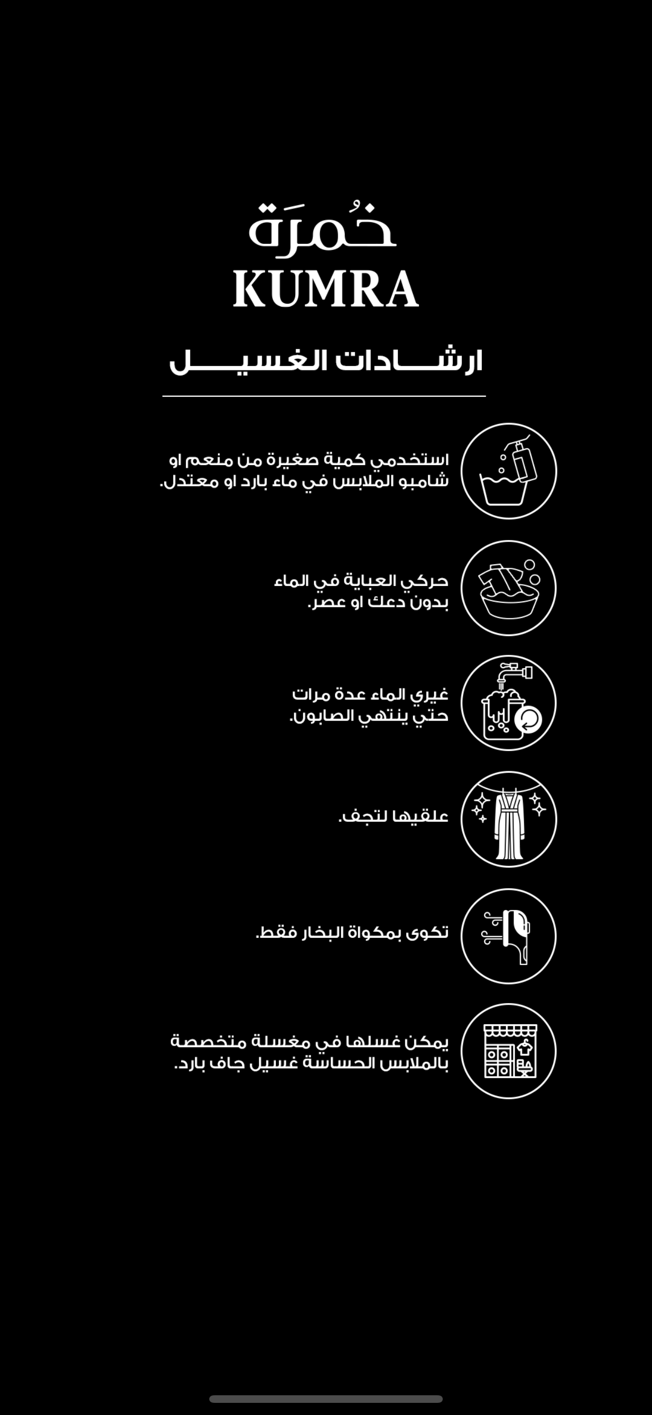 - يمكن غسل العباءة في مغسلة متخصصة بالمستلزمات الحساسة باستخدام غسيل جاف بارد.